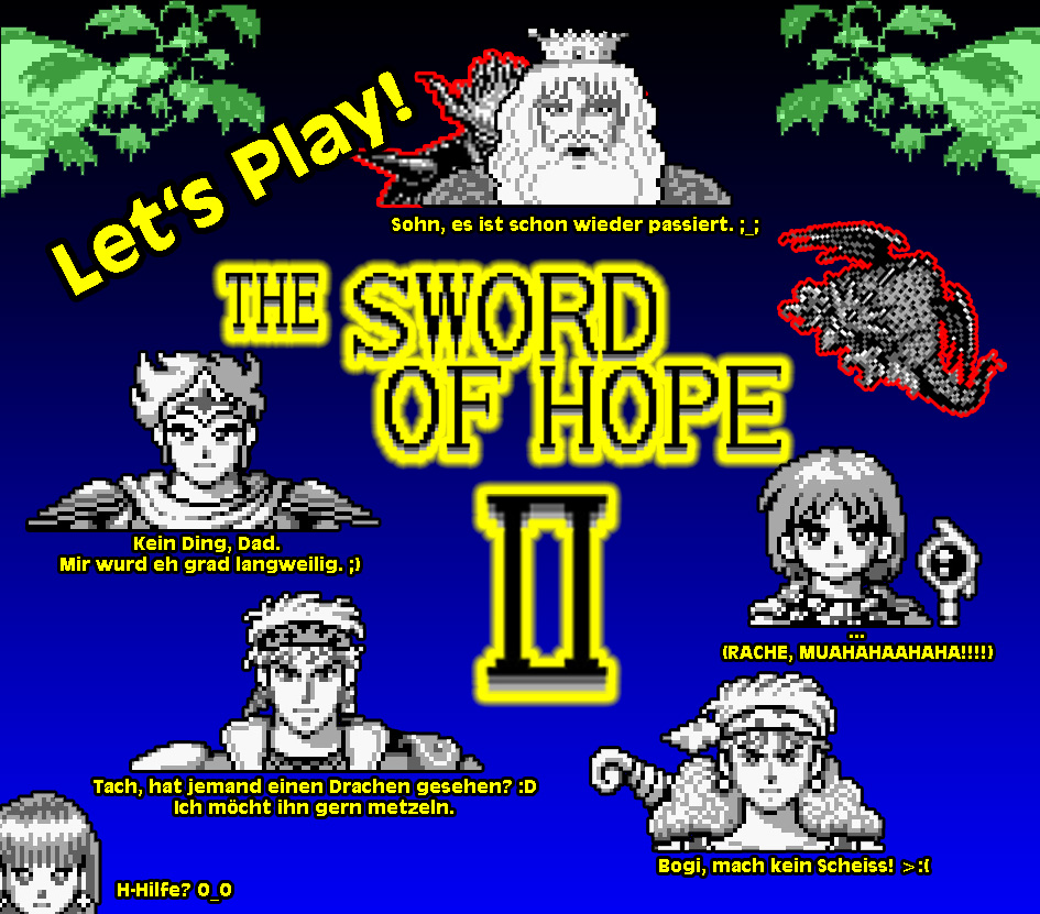 "Wieder Trouble in Riccar" Video Update, Teil 8: Nach einiger Zeit war es mal wieder Zeit mich dem kleinen Kosmos der Sword of Hope-Reihe zu widmen (gibt ja nur 2 Spiele). Leider ist Teil 2 nie in deutsch erschienen, und ich weiß garnicht ob es überhaupt hierzulande käuflich zu erwerben war. Ich hab das Spiel ebenfalls importiert. Was schade ist, denn SoH2 hat viele Verbesserungen gegenüber Teil 2, wie bessere Grafik und ein komplexeres Kampfsystem mit bis zu drei Charakteren. Die Story ist gemütlich-gewohnt altbacken; irgendein Depp hat die Gruft des Oberbösemeisters Zakdos (nicht Zapdos ihr Pokemon-Jünger) geöffnet und zeitgleich wurde auch noch das Schwert der Hoffnung dem König unter der Nase wegstibizt. Da King Hennessy sich noch von seiner Prügel erholen muss die Theo ihm im ersten Teil hat angedeihen lassen (natürlich nur um ihn dadurch von seiner Besessenheit zu heilen *hüstel*) muss Theo himself mal wieder ausziehen um das Ganze Debakel rückgängig zu machen. Dabei trifft er auf viele neue Freunde und Feinde die ihm mal mehr, mal weniger nützlich zur Seite stehen. Ja, ich guck dich an, Nina! Komisches Käferaugen-Mädel! Aber Bogi entschädigt eh für alles. Ich war ja immer ein Freund von Rollenspielen und da diese auf den Nintendo-Konsolen recht rar gesäht waren (bezogen auf Europa, Amerika / Japan hatten da mehr Material), war Sword of Hope 1 eine Offenbarung für meine nach Abenteuern lechzende Spieler-Seele. Und Teil 2 wurde grausamerweise in einer Spielerzeitschrift angeteasert (es war die Total! 10/96) und mit einer sehr guten 2+ bewertet. Ich habe den Artikel mehrfach gelesen und habe mir schon selbst vorgestellt wie ich es selber spielen würde. Die Bilder habe ich ebenfalls akribisch analysiert und konnte es nicht abwarten dieses RPG-Kleinod zu erwerben. Aber nirgend war es zu finden, in keinem Spielegeschäft (amazon und co. gab es damals ja noch nicht, da musste man noch immer in einen Laden in der nächsten Stadt rennen und hoffen, dass da was wäre). Enttäuscht widmete ich mich wieder anderen Dingen, bis ich dann Jahre später beschloss dieses Trauma zu beenden und es mir via ebay zu besorgen. Voila! Danke Internetz! :D Without futher ado; hiero nuno das Schwert der Hoffnung, Teil 2! Go Theo, go! Let's Play - Sword of Hope (GB)