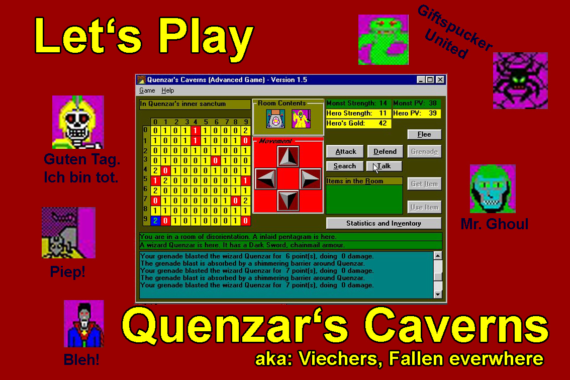 "Shareware-Doppelpack" Video-Update 13 (oh nein, Unglück!): Simon ist endlich wieder zu Hause (auch wenn das Sequel gleich danach angeteasert wird, durch die gruselige Monsterhand) und wir wenden uns indes anderen Abenteuern zu. Diesmal bringe ich gleich zwei Windows basierte SHAREWARE-Spiele mit, die man aber auch so ohne weiteres zocken kann. Sehr mininmalistisch sind sowohl Quenzar's Caverns als auch Hero - The Challange, was aber (zumindest bei mir) immer die Phantasie anheizt und dem Spielspass keinen Abbruch tut. In Quenzar sind wir ein Held der durch ein quadratisches Labyrinth stolpert (zufällig generiert, aber mit eigner Identifikationsnummer, sodass man es jederzeit neu spielen kann, solange man diese Nummer hat) und dabei gegen Monster kämpfen, Gegenstände sammeln und Fallen überwinden muss, um am Ende gegen Quenzar, den titelgebenden Zauberer und Antagonisten anzutreten. Simples Prinzip mit hohem Suchtpotenzial. Ich wollte mal (wie ich im Video erwähne) eine ganze Reihe von Spielen machen, da die Level recht kurz sind, aber andere Spiele kamen dann wieder dazwischen (sehr lästig). Aber wie das halt so ist. Dennoch: 2 "Helden" führe ich dann doch noch durch dieses kleine, nette RPG. Ist was für zwischendurch, eine Art "Mittagspausen-Rollenspiel". ;)