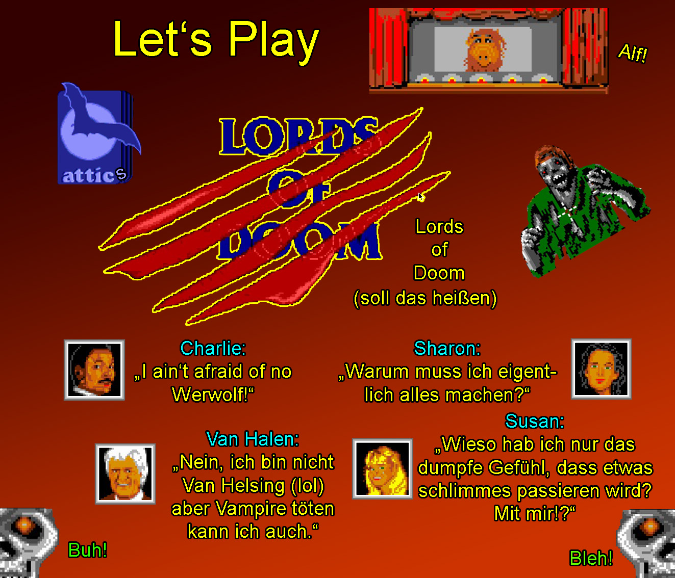 (Wappentiere der Staufer und somit auch von Friedrich Goldbart). "Monster in town" Video-Update 15: Geht doch! Alexander ist nun nicht nur König von Airath (mal wieder) sondern auch von Oghantar und Annathar sicher auch (mit Eneyas Hilfe). Da diese epische Thron-Besteiger-Geschichte nun beendet ist, beginnen wir sogleich eine neue. Diesmal geht es wieder auf den DACHBODEN, alten Spielern auch bekannt unter der englischen Bezeichnung ATTIC. Ja, sie haben noch mehr gemacht! ;D Lords of Doom ist ein Spiel, welches ich damals auf einer Compilation CD besaß; genannt "Games, Games, Games: Volume 5". Mit dabei waren noch Zak McKracken, MadTV, Lollypop und Traders. Lords of Doom war das einzige Adventure/Rollenspiel darauf und damit automatisch mein heimlicher Favorit. Da ich aber keine Ahnung hatte was man alles machen musste um weiterzukommen, blieb es meist dabei ein bisschen durch die Stadt zu latschen und sich dann von Werwölfen, Mumien, Zombies und / oder Vampiren abmurksen zu lassen. Ich war ja froh, dass ich herausgekriegt habe wie man das Küchenmesser (!) als Waffe einsetzen konnte. Außerdem fand ich es arg unheimlich durch eine leere Stadt zu schlurfen und dann muss man noch Essen und Trinken! Es war also nur eine Frage der Zeit bis ich es endlich mal vernünftig durchspielen würde. Diese Zeit ist nun gekommen. Begleiten wir also die, bis zu 4, Charaktere in einer menschenleeren Geisterstadt, in der welcher die vier "Lords of Doom" (Titledrop!) ihr Unwesen treiben. Es obliegt unserer heiteren Bande diese Kreaturen des absolut Bösen auf klassische Arten (Feuer vs. Mumien, Pflock vs. Vampir, Silberkugeln vs. Werwölfe und geweihte Erde (?) gegen Zombies) von ihrem Untoten/Monsterdasein zu erlösen. In vieler Hinsicht erkennt man ständig, dass die Macher der Nordlandtrilogie auch dieses Spiel fabriziert haben. Sei es der typische ATTIC-Humor (leider ohne Käsetoast-Referenzen), die Optik oder das Gameplay. Es fühlt sich einfach nach ATTIC an. Und das ist sicher nicht das schlechteste! Also auf zum fröhlichen Monsterjagen!