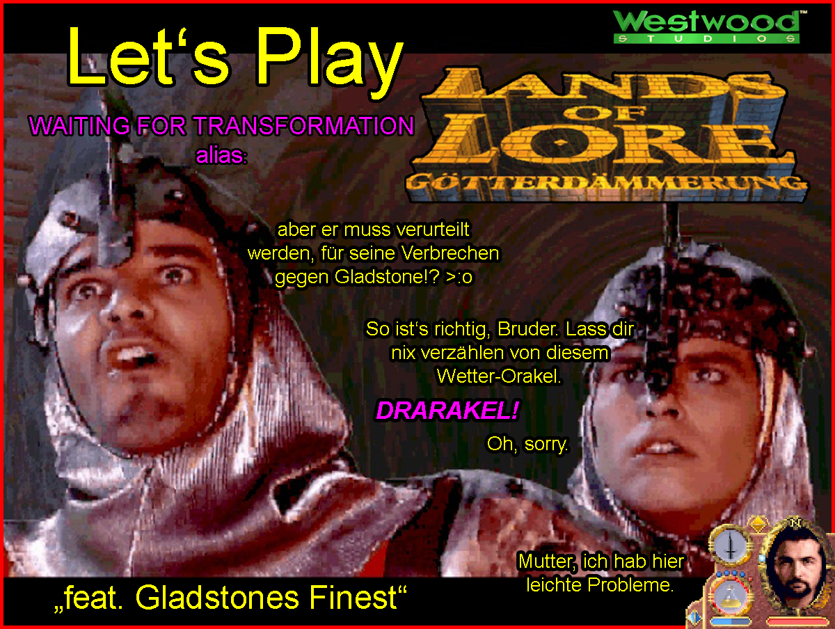 Opferung an ihrer Schläfe hatte. "Waiting for Transformaion" Video Update 18 Komisch Bartman (alias Artreju) hat das Auryn wieder zusammengebastelt, und so Fantasien vor dem Nichts, der Veränderung oder der Dummheit (sucht euch was aus) bewahrt. Und irgendwo brüllt ein Junge auf dem Dachboden während Blitze auf ihn niederschießen. Das war Auryns Quest.!Welche eine herrliche, nicht vorhandene Überleitung zu meinem nächsten Projekt! :D Es handelt sich um die Fortzsetzung des Spiels, in welchem Meister Conrad am Ende gesiegt hat (mit Baccatta und Paulson, RIP Timothy ;_;< ) und das ist CANON. Ich meine KANONE... öh? Also, der Conrad ist der kanonische Held, zumindest für mich. Aber Westwood sagt ja, es sei Hulinen-Kieran gewesen. Hmpf! Wieso haben die das letzte Wort, sind die Gott? Vielleicht, aber darum gibt es ja auch jetzt die GÖTTERDÄMMERUNG! (bessere Überleitung get) Wir spielen als Luther; ein junger Bauerndödel aus Gladstone und vom Schicksal mehrfach vorbestraft. Denn unsere liebe Frau Mutter ist niemand geringeres als die Oberhexe Scotia aus Part One! Und als die dunkle Arme ("the darrrrk arrrrmy") besiegt wurde, lenkte sie die Energien der Niedermaske in ihrem letzten Moment nach Gladstone zurück - direkt in Luthers Allerwertesten hinein. Vermutlich um dem Sohnemann etwas Gutes zu tun? Keine Ahnung. Scotia hatte anderes im Kopf als Mutter zu sein, denke ich. Hierdurch ergaben sich negative Nebeneffekte und Luther verwandelt sich ab da spontan in diverse Monster: eine kleine niedliche Echse und in ein großes, hässliches Monster mit Irokesenschnitt aus der (Niedermasken-)Hölle der Friseurschule. Im Gameplay äußerst sich das in einen Effekt, den ich "Waiting for transformation" getauft habe. Da manche Stellen im Spiel nur als Echse oder Monster erreichbar sind (eher ersteres) und sich lange Zeit nicht kontrolliert verwandeln kann, muss man halt warten und Glück haben. Das ist genauso spannend wie das Museum des Drarakels wenn man schon alle Exponate gesehen hat. Aber abgesehen von diesem Makel ist LoL2 (lol!) ein ambitioniertes 3D-Action Rollenspiel, welches mit Sprachausgabe und Schauspielern "aufgewertet" wurde. Schon damals als verpixelt geltend, fand ich das damals unglaublich cool und futuristisch (technisch). Und als Pixeljünger machen mir Pixel auch nichts aus. LOL2 hat ebenfalls wieder seinen eigenen urtypischen Westwood-Charme. Zusammen mit den obligatorischen Außerirdischen gegen Ende. Und Belial ist auch eine coole Sau, Verzeihung, ich meine natürlich Monster-Spinne. Conrad ist zwar nicht dabei, aber Luther ist ein passender Ersatz für ihn. Er hat ein Bärtchen und ein lockeres Mundwerk. Man kann Luther auf zwei Arten spielen: Als irren Bösewicht der alle niedermetzelt (Freund wie Feind) oder als verlorenen Sohn der eigentlich nur in Ruhe seinen Kräutergarten "back in Gladstone" bewässern will. Ratet mal wie ich ihn spiele. ;) Ich bin halt Oldschool, was soll ich sagen! Die Entscheidungen, die man trifft verändern den Spielablauf (minimal, Level bleiben gleich) und man bekommt ein anderes Ende präsentiert. Also dann! LET THE WAITING FOR TRANSFORMATION BEGIN...