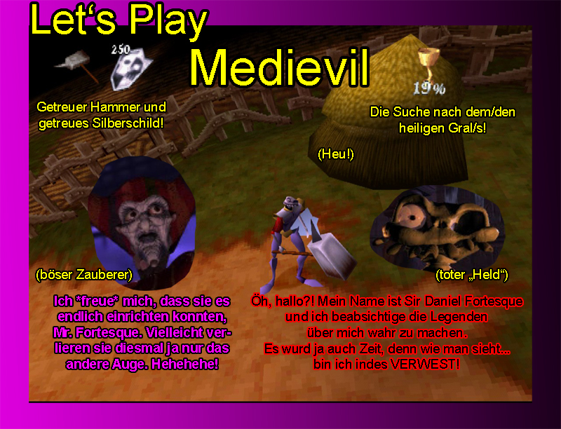 Im Lande Gothos herrscht wieder Ruhe, und das verdanken wir Melvin und seiner tiefen Stimme! Also lebe der Dreamer-Steamer hoch und mögen noch viele weitere *ähem* Dreamer-Steamer folgen. Wenn sie wissen was ich meine. EGAL! Jetzt wurde genug gelebt, nun wird gestorben. Und zwar in dem Playstation-Spiel Medievil. Ein Action-Adventure mit bisweilen nerviger Kamera aber stimmiger Grafik und einem sehr "britischen" Humor. Dabei ist das Spiel eigentlich mehr französisch. Ist wohl ein Überbleibsel aus dem 100jährigen Krieg. Nunja. Hauptsache Medivil. Wir sind Daniel Fortesque, ein Held der eigentlich keiner ist, aber jeder glaubt es. Nun - jahrhunderte später - muss er beweisen, ob er die Vorschusslorbeeren wirklich wert war oder doch nur eine Lulli-Lusche vom Dienst. Ihm fehlt zwar ein Auge, aber dass ist weniger wild, da ihm ja auch sonst alles Fleishch fehlt und er nur durch Magie am "Leben" erhalten wird. Seine Nemesis ist der Zauberer Zardok oder Zardoz (alias: irgendso ein Depp mit lächerlicher Kopfbedeckung und Bruce-Campbell-Gedächtnis-Kinn). Der will die Herrschaft über das Land. (the laaaaaannnnnnndsss) Das übliche halt. Eine klassische Story, nur das diesmal der Held selbst ein Untoter ist und das Spiel sich selbst nicht ganz so ernst nimmt. Ich selbst habe damals häufig die Medievil-Demo gespielt, welche es auf einer Demo-CD zur Playstation dazu gab (zusammen mit einigen anderen Demos). Darin enthalten waren dann die ersten drei Level - wir aber wagen uns an alle Level, letztlich sinds immerhin 21 davon. 1 Anmerkung noch: LP-Puristen seien gewarnt, weil ich in diesem LP Save-States verwende. Der Grund dafür ist primär/banal, dass ich kein guter Medievil-Spieler bin und generell bei Action-Spielen dazu neige mich zu verhaspeln und nervtötenden Murks zu bauen. Und es liegt auch daran, dass Medievil definitiv einen Ruf als schwieriges und auch eher "hakeliges" Spiel hat. Das liegt an den teils ungünstigen Kamera-Einstellungen, den sofort-tödlichen Abgründen und einer schwammigen Steuerung. Alles zusammen genommen, hielt ich SavesStates für sinnvoll, da niemandem damit gedient ist, wenn ich aus Frust zum 5. Mal an derselben Stelle scheitere. Naja, hauptsache man hat Spaß. Soweit das Vorgeplänkel, nunmehr zum Hauptmenü!! :D