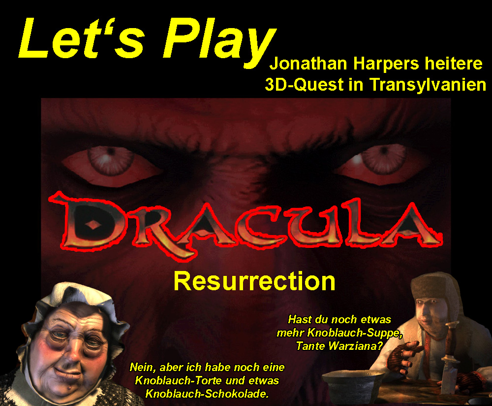 "Herbstlicher Grusel"; Video-Update 22 Kyrandia ist dank Brendon wieder sicher (für den Moment jedenfalls) und auch auf Albion herrscht eine neue öko-freundliche Eintracht zwischen Technik und Natur. Rainer kann sich seinen Studien widmen und Sira und Mellthas können endlich ihre Hochzeit feiern. Alles Jute und herzlichen Glückwunsch! Nun geht es herbstlich weiter, und mehr oder weniger zeitlich passend zu Samhain alias Halloween, kommt ein LP von einem Gruselspiel, welches ich wegen seiner 3D-Optik und Atmosphäre schon bei der Demo (die ich damals von irgendwoher hatte) gemocht habe. Es handelt sich (die Gruft öffnet sich!) um Dracula - Resurrection, ein Adventure Spiel. Man spielt als Jonathan Harker und darf der geliebten Mina nach Transylvanien hinterrennen, da sie sich dorthin "hingezogen" fühlte. *seufz* Nunja, das Spiel hat auch einige interessante (manche würden fieserweise sagen hässliche) Charaktere, welche mir immerhin auch Jahre danach noch im Gedächtnis geblieben sind. Ihr werden sehr bald bemerken wieso. Siehe auch das LP-Bildchen, das ich gemacht habe. Ich find's toll (und lustig)! :P Weniger lustig ist die Soundabmischung im Spiel, sodass viele Stimmen in der Musik untergehen, respektive oft viel zu leise klingen. Deshalb musste ich das Video nachbearbeiten und habe die Sprechsequenzen an den entsprechenden Stellen normalisiert. Ist etwas holprig, aber ich hoffe es ist nun besser verständlich. Let's Play - Dracula Resurrection (PC)