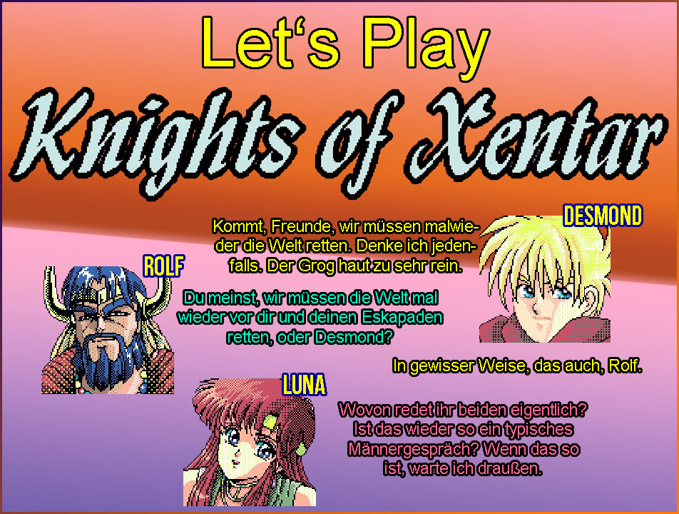 sind zumindest im Ansatz planbar: Weihnachten und Neujahr! Ich hab hier noch so einige alte Sachen rumliegen, darunter Videos, in denen ich über Warhammer quatsche. Und über Asterix - primär meinen Lieblingsband; Axterix und die Goten! Warum ich den so sehr mag, erkläre ich dann in dem verlinkten Video. (Kann das Zeug ja nicht noch alles abtippen, ich muss mich auch irgendwann an Friesenrecht Akt 10 machen!) LP-technisch "beglücke" ich euch mit einem meiner persönlichen Lieblings-Anime-Rollenspiele. Später hab ich ja auch solche Perlen wie Grandia 1 (sowie 2) gezockt, aber KNIGHTS OF XENTAR, war das erste wirklich "japanische" Rollenspiel für mich. Waren Spiele wie Secret of Mana, Mystic Quest oder Zelda zumindest im Ansatz sehr stark an Manga/Animes angelehnt (soweit man das bei den Pixeln überhaupt beurteilen konnte), so war es "KoX" dagegen sehr klar. Das fing schon bei dem motivierenden Coverbild des Spiels an. *räusper* Jaaaa, ich leugne nicht, dass ich es just deshalben bestellt habe! Damals noch aus einem PEARL-Katalog, resp. meine Eltern haben es mir bestellt, da ich seinerzeit noch ein junger Spunt war. Über PEARL bin ich auch an Might and Magic (3,4,5) gekommen. Eine tolle Zeit! Das Spiel selbst ist schon eine andere Hausnummer als die Nintendo-Spiele, ganz besonders was die Schlüpfrigkeit angeht. Es ist eine Mischung aus RPG und heiterer "Höschenjagd" (wie Patrick/Spongebob sagen würden); nimmt sich aber zu keiner Sekunde ernst. Basierend auf der Dragon Knight-Reihe, ist dies eigentlich der dritte Teil jener Spielreihe, deren erste beiden Teile jedoch nie außerhalb von Japan erschienen sind und spielerisch auch noch mehr Old-School Rollenspiele sind, als der eher laxe dritte Teil (=Knights of Xentar). Es werden sogar viele Grafiken aus diesen beiden ersten Teilen recycelt, was unsereins aber natürlich nicht auffällt. Naja, besser gut von sich selbst kopiert, als schlecht neu selbst gemacht, eh? Aber die Schlüprigkeiten und der Humor der Reihe ist - soweit ich das beurteilen kann - in allen Teilen vorhanden. Es geht hier um den Helden Desmond (im japanischen: Takeru), welcher sich gegen Dämonen, Hexen und Frauen erwehren muss. Manchmal mit dem Schwert, manchmal mit "anderen Mitteln". Es gibt auch einen kurzweiligen Anime, indem die Ereignisse des ersten Dragon Knight-Spiels verwurstet wurden. Und auch die gute alte Luna ist da schon mit von der Partie. Ich jedenfalls hatte seinerzeit meine helle Freude an diesem Spiel, noch nicht einmal so sehr wegen der (zenzierten) "Stimmungsbildchen", sondern wegen der Witze, der Beziehung zwischen den drei Haupthelden (Desmond, Rolf und Luna) sowie der SPRACHAUSGABE. Nach meinem Simon the Sorcerer-Debakel (ich hatte das Spiel, aber die Sprachausgabe dort ruckelte nur und war praktisch unspielbar), war ich für jedes Spiel, welches dann eine funktionierende Sprachausgabe hatte unendlich dankbar. Dieses Spiel ist komplett synchronisiert und das sogar sehr gut wie ich finde! Das hält mich aber trotzdem nicht davon ab, dieses LP mit meinen eigener Stimme zu versehen. Nicht, dass ich die Synchro nicht TOP! finde, aber bei meinen Aufnahmen des Spiels klangen die Stimmen doch immer zu leise. Außerdem wird wirklich viel geredet, sodass ich über weite Strecken nur stumm zuhören kann. Das fand ich dann doch etwas öde und auf diese Art kann ich auch mein eigenes Tempo halten. Wie ich es auch schon bei Simon the Sorcerer gemacht habe. Hmmm... Ich frage mich gerade, warum ich just diese beiden hier in einen Topf werfe - vielleicht wegen des Humor-Anteils?. Egal, auf geht es! Es gibt Pökelfleisch in Gin eingelegt! Köstlich! *gübel*
