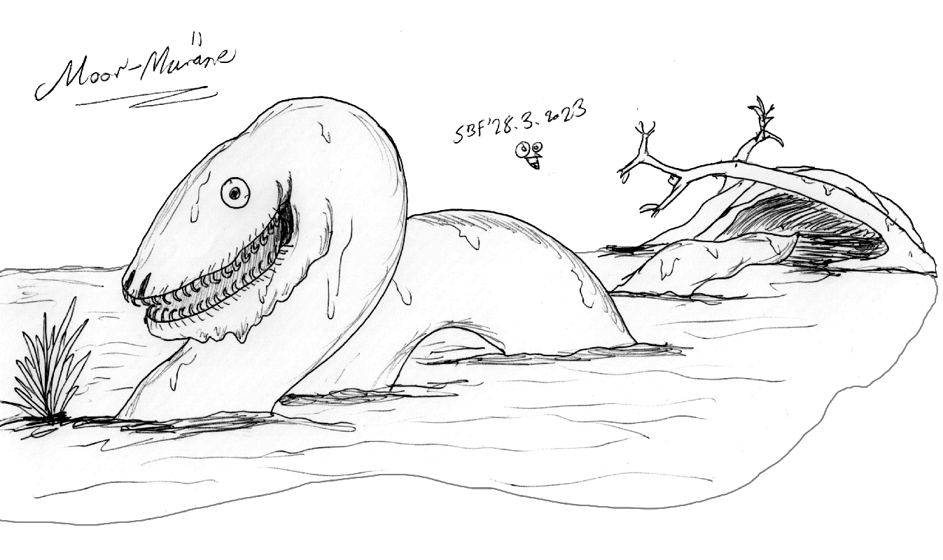 Dieser Fisch-Schlangenhybrid kann auch an Land überleben und treibt sich bevorzugt in Sümpfen und Mooren herum. Dort bewohnt er kleine Höhlen, welche er durch wildes Herumschlagen seines bis zu 7 Meter langen Körpers "errichtet". Dort liegt sie, aufgekringelt wie eine Schlange und lauert bis sich jemand nähert. Dann schnellt sie aber blitzschnell hervor und reißt ihre Opfer mit ihrem großen Maul, welches mit Widerhaken-Zähnen gefüllt ist in Stücke. Auch ihren Körper wuchtet sie dabei wild herum und peitscht das Wasser auf. Die Haut der Muräne ist zäh wie Leder und so schleimig, dass viele Waffen einfach abgleiten. Ist kein Opfer zugegen, geht die Muräne bei Dämmerung auf Jagd; wobei ihr ihre leblos wirkenden Telleraugen helfen zu im Dunkeln sehen. Auch ihr Geruchssinn ist stark ausgebildet, und man sollte sich ihrem Lager nur entgegen des Windes nähern. Wenn man sie denn jagen wollte... RIESEN-SCHLICKKREBS